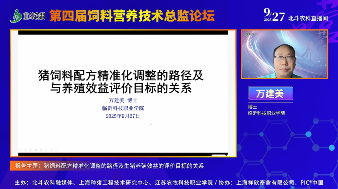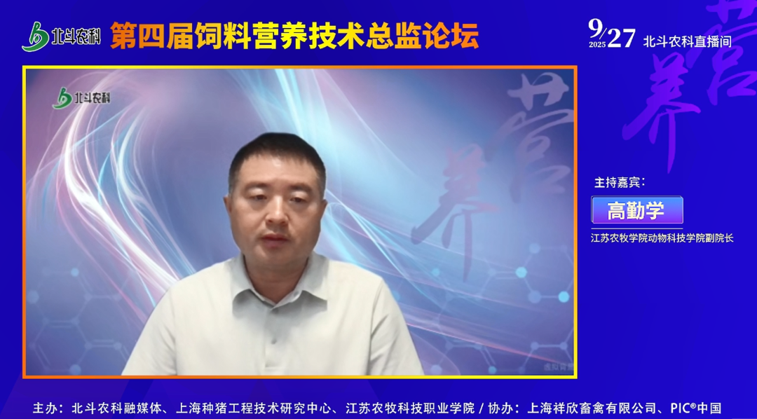 2025 年 9 月 27 日,由北斗农科融媒体、上海种猪工程技术研究中心、江苏农牧科技职业学院联合主办,牧太(上海)文化传媒有限公司承办的第四届饲料营养技术总监论坛,在北斗农科直播间顺利举办。本次论坛以 “破局・重塑:全球饲料变局下营养技术的创新突围与价值重构” 为主题,汇聚国内外饲料营养领域顶尖专家、技术总监及行业同仁,围绕全球饲料行业趋势、技术创新实践及应用解决方案展开深度交流,为行业应对复杂挑战、实现高质量发展注入新动能。