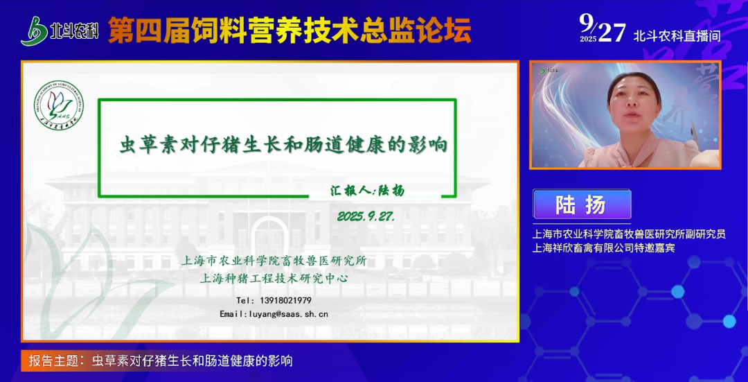 随后,上海市农业科学院畜牧兽医研究所 / 上海祥欣畜禽有限公司特邀嘉宾陆扬副研究员以 “虫草素对仔猪生长和肠道健康的影响” 为主题分享。她表示,饲料禁抗政策下,行业面临动物生长性能下降、养殖成本增加等问题,亟需高效安全的替抗方案,而虫草素作为天然核苷类物质,化学结构明确、便于检测且耐高温,具备较大替抗潜力。虫草素主要来源于蛹虫草等已成为食品资源的虫草,其栽培基质经生物提取可制备成虫草提取物添加剂。为验证该提取物效果,团队与四川农业大学合作开展实验,用 180 头杜长大三元断奶仔猪设 5 个添加剂量组,结果显示最佳剂量组仔猪末重增加 12.81%,全程平均日增重显著提升(前期达 37.19%),料重比显著降低,前两周腹泻频率明显下降,肠道完整性更高,血清中 D - 乳酸和组氨酸显著低于对照组,抗氧化能力提升,炎症因子得到抑制,脂肪、能量和蛋白表观消化率提高,结肠乳酸杆菌及乙酸、丙酸、丁酸水平升高。进一步实验发现,与 95% 纯度虫草素组均能缓解 LPS 导致的仔猪肠道损伤,降低病理评分,改善氧化应激,调节肠道菌群结构与代谢产物,通过补体与凝血级联反应等通路缓解炎症,证实虫草素可能是提取物发挥促生长、改善肠道健康作用的有效成分。