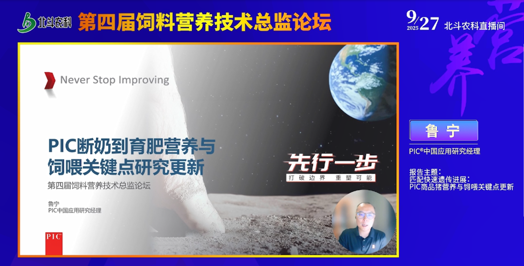 紧接着,PIC® 中国应用研究经理鲁宁博士围绕 “匹配快速遗传进展:PIC 商品猪营养与饲喂关键点更新” 分享,核心聚焦 PIC 商品猪遗传进展下的营养需求变化与饲喂优化策略。在遗传进展方面,2014-2024 年 PIC 父系终端公猪后代终身生长速度提升 64 克 / 天,眼肌厚度持续线性提高,商品猪收益率提升、料肉比降低,且生长曲线峰值更高、维持更大体重,赖氨酸等营养需求随遗传改良逐步增加,因瘦肉生长速度改良速率(3 年达全球平均)快于采食量(5 年达全球平均),需更高营养浓度日粮匹配生长需求。在营养需求研究上,2025 年生长育肥猪赖氨酸实验(1900 头猪)显示,110% PIC 赖氨酸推荐量组全期平均日增重显著高于 90% 组,料肉比显著低于 90% 组,虽与 100% 组及 “前 90% 后 110%” 组无显著差异,但提示更高赖氨酸供应或利于改善生产性能;2023 年色氨酸梯度实验(840 头猪)发现,SID 色氨酸与赖氨酸比值 19% 时,猪平均日增重、采食量达平台期,料肉比最优,该比值高于 2021 年推荐的 18%。在饲喂策略上,分阶段饲喂需确保阶段营养水平不低于初始体重营养需求的 85%,否则易致猪恶癖风险增加;高密度饲养(0.63㎡/ 头)时,将 SID 色氨酸与赖氨酸比值提高至 21%,可缓解采食量与日增重下降,使其接近正常密度(0.68㎡/ 头)水平;科学制定并严格执行饲料预算至关重要,前期料超量饲喂、后期料不足会增加成本,生产成绩改善后及时调整预算,每头猪饲料成本可进一步降低约 5 元。此外,他还推荐了 2024 版 PIC 商品猪理想氨基酸模型,为精准营养供给提供参考。