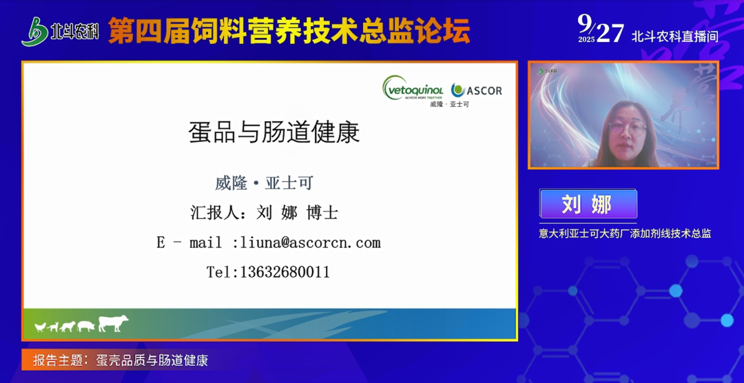 意大利亚士可大药厂添加剂线技术总监刘娜博士以“蛋壳品质与肠道健康” 为主题分享,聚焦蛋鸡养殖中蛋壳品质提升的营养调控与功能性添加剂选择。当前蛋鸡养殖追求 600 天养殖周期,蛋壳品质(如沙壳、水纹、裂纹蛋等问题)成为核心关注点,尤其粉壳蛋(占市场 70%)在养殖后期易出现品质下滑,而蛋壳超微结构中有效层致密程度、乳涂层宽度等微观指标与蛋壳品质直接相关,如乳涂层空隙大易导致水纹蛋,有效层光滑致密则可减少裂纹蛋。从营养角度,需结合蛋鸡品系设定营养标准,注重原料新鲜度与预处理(如玉米粉碎粒度、豆粕选择),生产工艺上控制钙磷供应(优先选择溶出度可控的石粉 / 石粒)、关注锰锌等矿物质(影响碳酸激酶活性)及维生素(如 VC 助力油脂膜形成),同时通过优化粉碎力度、混合时间减少分层,保障钙的溶出效率。在功能性添加剂方面,她强调天然来源与工艺处理的重要性,以单宁酸为例,天然提取(如栗木来源)的水解型单宁酸含邻苯三酚(抗氧化、收敛)、奎宁酸(杀菌抑菌)等功能团,经喷雾冷凝包被工艺处理后,可减少对胃蛋白酶的影响并实现缓释,在潮州蛋鸡实验(2.5 万只大午金凤)中,添加 250 克 / 吨单宁酸(丹尼诺)8 周后,蛋壳强度从 29.98 提升至 35,破损率降低,哈士单位改善;攻毒实验显示其可抑制产气荚膜梭菌、大肠杆菌,减少肠道炎症,且在台风应激下可降低蛋鸡死亡率。此外,她还提及天然精油(如肉桂醛精油,经 BMP 工艺处理)的应用效果,强调功能性产品需通过流散性、采食量影响、生物学利用度、质谱分析(纯度)及饲养试验综合评估,且工艺(如包被、缓释)是决定产品在动物体内效果的关键,最终需通过优质原料与合理工艺,实现蛋壳品质提升与养殖效益优化,避免陷入低价内卷,打造差异化价值产品。