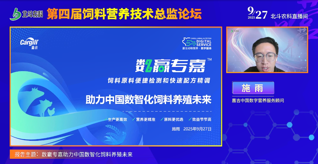 嘉吉中国数字营养服务顾问施雨围绕“数赢专嘉助力中国数智化饲料养殖未来” 分享,介绍嘉吉动物营养推出的覆盖 “检测 - 营养换算 - 配方落地 - 生产” 全流程的数字营养服务。该服务以嘉吉 130 余年原料研究积累(年检测超 300 万样品、1800 + 近红外原料模型)为基础,依托 CNC 营养学体系,提供原料检测(台式 / 手持近红外 + 湿化学,检测指标含谷物类含糖淀粉、蛋白类 IVPD、动物原料生物胺等,贴合营养学需求)、云端数据转换(嘉吉云平台搭载 Auto 动态计算公式,将检测值快速转化为可消化氨基酸、净能等数百条配方用营养值,支持定制化报告与多格式导出,打通品管与配方技术壁垒)、配方软件配套(匹配 Max Bios、Brill Mix 等主流软件,提供技术顾问支持)及未来闪电配方、实时近红外系统等升级服务,且保障数据安全与定制化云服务。案例显示,通过该服务可精准捕捉原料波动(如次粉净能差异近 300 大卡 / 批、同厂豆粕价差 225 元 / 吨),评估原料真实价值(如用 IVPD 评估豆粕质量、挖掘苹果渣等地产纤维原料替代潜力),助力养殖 / 饲料企业实现精准采购、配方优化与降本增效,同时统一技术交流语言,提升行业数字化营养管理水平。
