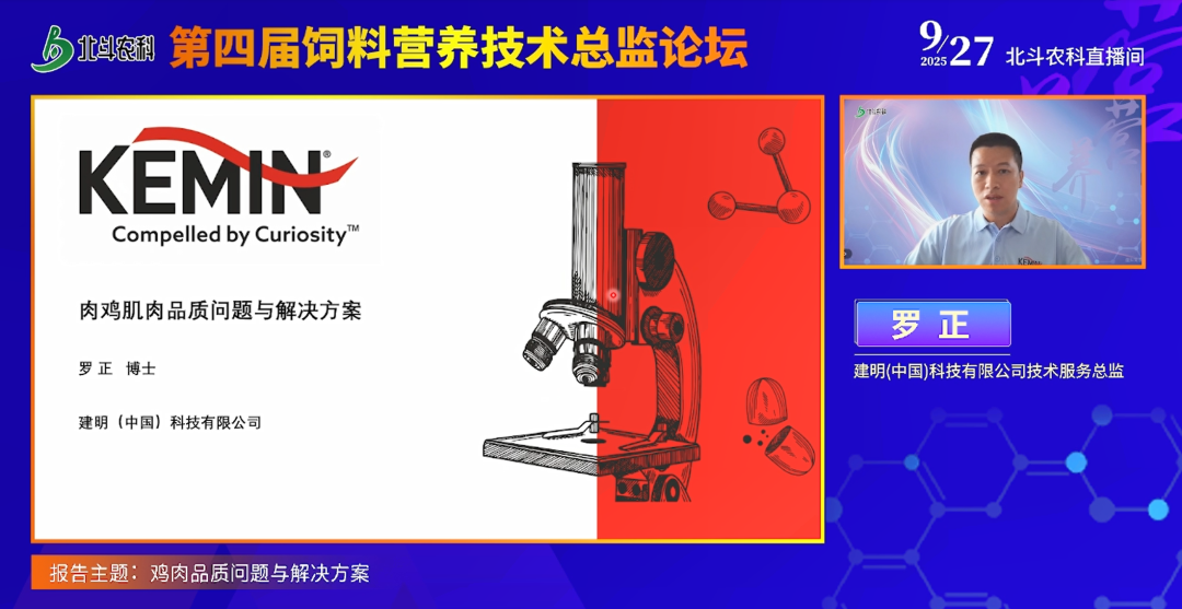 最后,建明(中国)科技有限公司技术服务总监罗正博士聚焦白羽肉鸡鸡肉品质问题分享,首先梳理国内肉鸡产业格局——2024 年白羽肉鸡出栏 90 亿羽(占比 61%)、黄羽肉鸡 33 亿羽(占比 22%)、817 小白鸡 24 亿羽,预测未来快大型黄羽肉鸡或持续萎缩、817 小白鸡将保持增长。随后详解鸡肉品质的核心维度(安全性、外观、适口性、营养价值等),指出白羽肉鸡与黄羽肉鸡在售卖方式(白羽多分割销售、黄羽多整只 / 切块销售)、价格与风味上的差异,重点分析白羽肉鸡胸肌常见品质问题:一是传统的 PSE 肉(pH 值快速降至 5.6、苍白软嫩、滴水损失大,发病率 5%-40%)与 DFD 肉(pH 值下降慢、深红干硬、保水力强);二是近年受关注的深胸肌炎(绿疾病,因胸小肌供血受阻致坏死、绿变,体重大的白羽肉鸡高发)、白条纹肉(肌纤维周围星形细胞转化为脂肪细胞形成白条纹,严重者宽度超 2 毫米,2017 年部分地区发病率达 70% 以上)、木质鸡胸肉(毛细血管供血不足致肌纤维损伤,结缔组织增多、硬度高,可承受 260 牛压力,2022 年加拿大调查仅 17% 鸡胸正常)、面条鸡胸肉(空泡化严重、肌纤维发育差,意大利调查发病率 21%),且这些问题常叠加出现(约 1/3 鸡胸存在三种问题)。他还分析影响因素:遗传(宽胸系风险高)、环境(夏季 / 春季发病率高于冬季,热应激影响大)、营养(高能量日粮或致发病率上升)、管理(孵化缺氧过热、运输距离长、屠宰工艺不当等),最后提出防控方向 —— 选择适宜品种、优化营养配方(如三阶段日粮或更适配不同生长阶段)、改善养殖与孵化环境(笼养利于控温通风)、规范屠宰流程(把控电晕、冷却等环节)、强化品控分级(筛选优质肉品对接市场),并强调需营养、生产、兽医、屠宰等多部门协同,才能有效减少鸡胸品质问题,保障白羽肉鸡产业高质量发展。