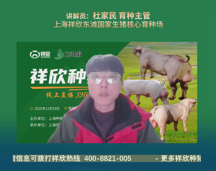 12月,上海祥欣畜禽有限公司第23期祥欣种猪秀直播如期而至,付茂董事长携育种团队重磅登场,以 “培育华系大体型优质种猪” 为核心,为畜牧业同仁带来一场兼具行业洞察与实操干货的视听盛宴。本次直播由上海种猪工程技术研究中心主办,祥欣联合北斗融科融媒体承办,不仅深度解析了大体型优质种猪的选育逻辑与市场潜力,更精选 15 头优质种公猪精彩亮相,用硬核实力为行业低谷期注入发展信心。