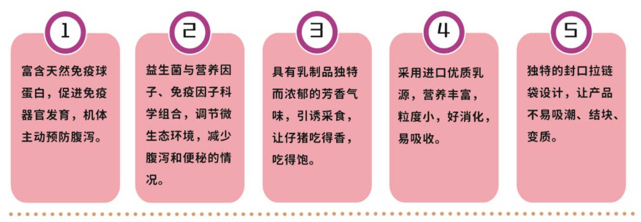 六、仔猪的消化系统和免疫系统发育不够完善,断奶应激、换料应激造成仔猪腹泻,死亡率增加一直是猪场亟待解决的问题。代乳粉的成分和母乳相似,富含乳糖,乳糖可帮助胃内产酸,改善断奶仔猪无法从母乳获得乳糖及胃酸分泌不足的情况,补充营养、促进消化,更能保护肠道不受外源抗原损伤,帮助仔猪平安断奶,缓解断奶应激。