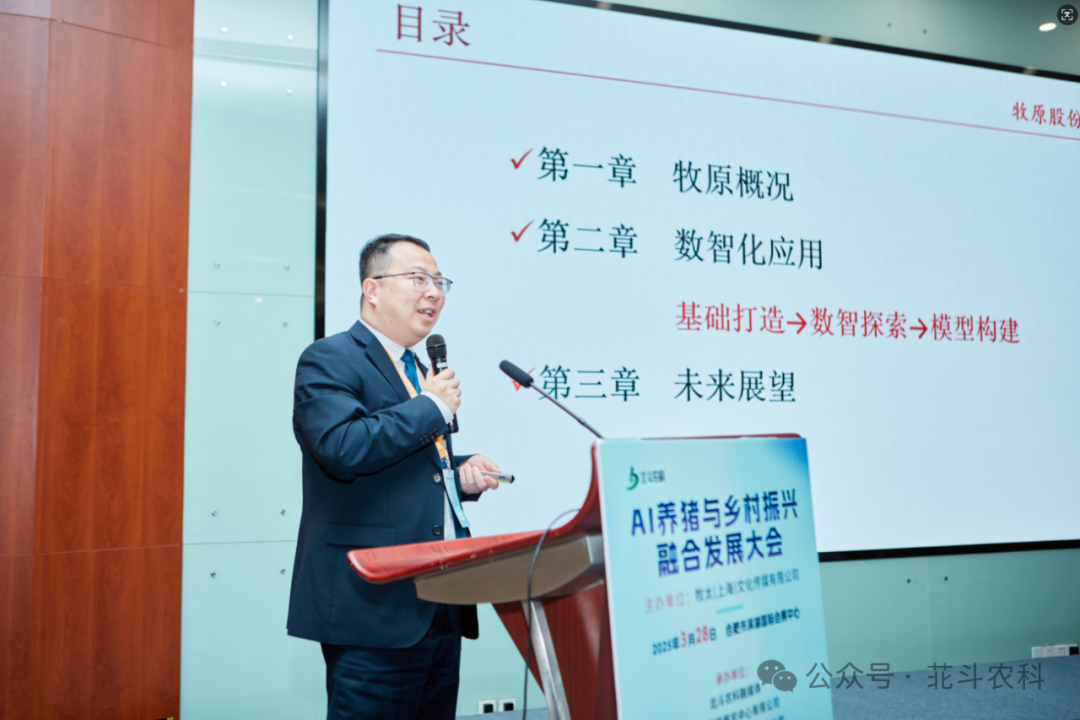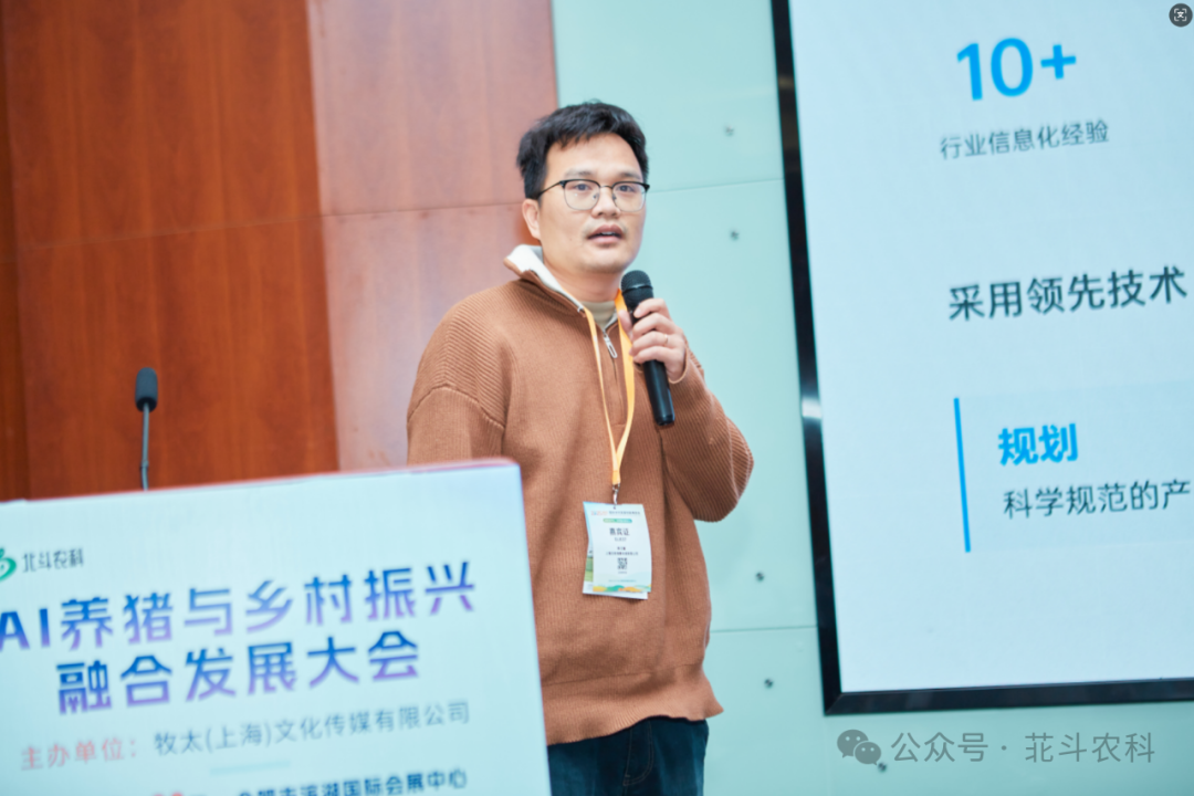 河南牧原智能科技有限公司副总经理胡冬分享了 “牧原智能养殖实践与展望”。牧原从 1992年起步,已形成全产业链布局,2024年出栏生猪7160万头。在数字化发展历程中,从2011年上线财务ERP开始,逐步完善各业务系统。公司拥有近1000人的研发团队,30余种、230万套智能设备,推出空气过滤、精准饲喂、智能巡检等设备,构建养猪大模型,实现对猪群健康、生长的精准监测与管理,提升养殖效率与效益,积极探索产业互联新路径。