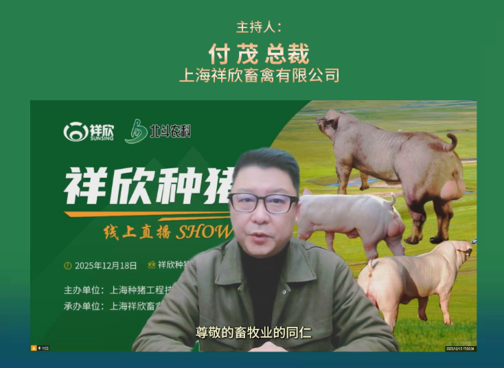 12月,上海祥欣畜禽有限公司第23期祥欣种猪秀直播如期而至,付茂董事长携育种团队重磅登场,以 “培育华系大体型优质种猪” 为核心,为畜牧业同仁带来一场兼具行业洞察与实操干货的视听盛宴。本次直播由上海种猪工程技术研究中心主办,祥欣联合北斗融科融媒体承办,不仅深度解析了大体型优质种猪的选育逻辑与市场潜力,更精选 15 头优质种公猪精彩亮相,用硬核实力为行业低谷期注入发展信心。