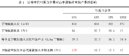 表1显示了当山羊喂给能量含量达到机体维持需要水平的日粮时,日粮中的粗蛋白(CrudeProtein,CP)含量对其肠道甲烷产量的影响。试验所用的日粮含4%(CP4)、7%(CP7)、9%(CP9)和12%(CP12)四种粗蛋白水平中的一种。
