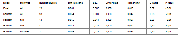 随机效应模型也得出了类似的结果,饲喂奇力素与对照组相比日增重增加0.064g/头(P<0.01)(表2)。再比较不同饲喂类型(代乳粉、全乳或者废弃奶加代乳粉)添加奇力素对犊牛日增重的影响。结果如下:饲喂代乳粉加奇力素组比饲喂代乳粉组日增重增加0.055g/头。饲喂全乳加奇力素组比饲喂全乳组日增重增加0.071g/头。饲喂废弃奶加代乳粉加奇力素组比废弃奶加代乳粉组日增重增加0.068g/头(表2)。