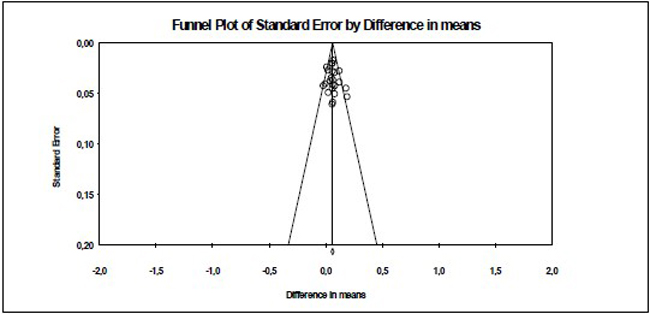漏斗图显示这些统计结果真实有效,没有发表偏差和选择性偏差。漏斗图的纵坐标表示样本大小,横坐标表示效应值。大量的研究在漏斗图的顶部附近,并聚集在平均效应值附近。很小一部分研究分布朝向漏斗图的底部,并且相对分散。