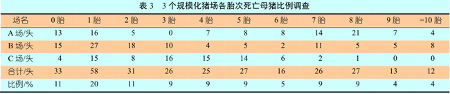 为了调查母猪死亡与胎龄结构的关系,我们对3个规模化猪场的死亡母猪数量与胎次进行了统计分析。结果表明(表3),各胎次母猪都有不同程度的死亡,但主要集中在初产母猪(0~2胎),特别是1胎母猪。此阶段母猪死亡数量达到了死亡母猪比例的42%,而经产母猪(3胎~5胎)死亡比例基本保持在平均水平(9%),但在第6胎的时候,母猪死亡比例突然下降,可能与该场人为采取的主动淘汰有关,淘汰后7胎~8胎的高胎龄母猪的死亡比例继续维持在平均水平,可能由于主动淘汰、长期死亡、母猪体质等选择作用,9胎~10胎的高胎龄母猪死亡率大大降低。因此该统计数据表示,初产母猪死亡比例异常,需要采取相应的措施降低此阶段母猪的死亡比例。