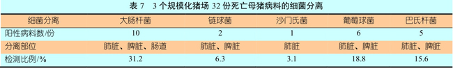 为了进一步确认引起母猪肺炎和胃肠道疾病的病原因素,我们对32份死亡母猪的送检病料进行了相关病毒检测和细菌分离,其中病毒检测项目包括PRRSV(普通和变异)、伪狂犬病病毒、圆环病毒、猪瘟病毒、口蹄疫病毒。实验室病毒检测数据(表6)显示,PRRSV的检出率最高(总共为43.7%),特别是变异PRRSV检出比例为28.1%,同时存在伪狂犬病病毒和圆环病毒的感染情况(各为6.3%)。细菌分离情况(表7)表明,大肠杆菌的分离比例最高为31.2%,其次葡萄球菌和巴士杆菌的分离比例也异常高,分别为18.8%和15.6%,同时偶尔也有链球菌和沙门氏菌的感染情况出现(分别为6.3%和3.1%)。从细菌分离部位可以看出,在所有阳性病料中都能从肺脏分离到细菌(表7),这表示死亡母猪的肺脏极易引发细菌感染,相反在肠道只分离到了大肠杆菌。