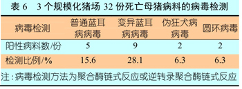 为了进一步确认引起母猪死亡的病原因素,我们对32份死亡母猪的送检病料进行了相关病毒检测和细菌分离,其中病毒检测项目包括猪繁殖与呼吸综合征病毒(Porcine Reproductive and Respiratory Syndrome Virus,PRRSV)(普通和变异)、伪狂犬病病毒、圆环病毒、猪瘟病毒、口蹄疫病毒。